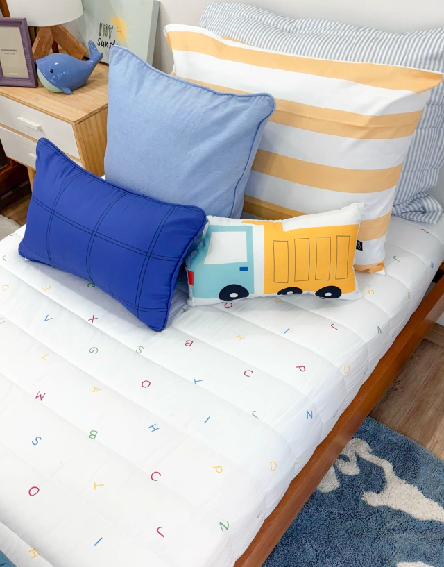 COMPOSIÇÃO: Tecido 100% algodão com elástico em toda volta. Enchimento de fibra siliconada.