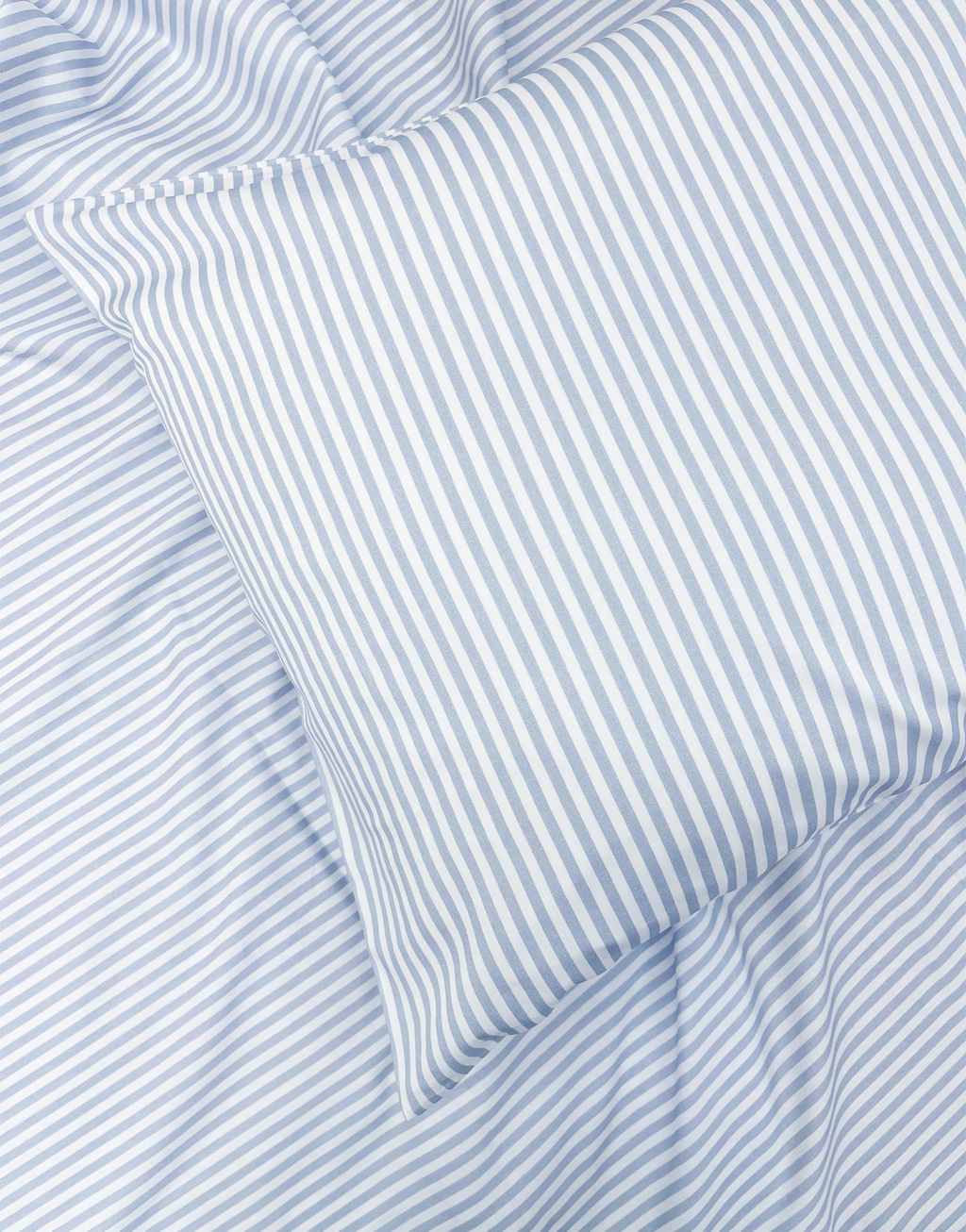 Lençol estampado com listrinhas azuis verticais, macio com toque acetinado, 200 fios e 100% algodão.